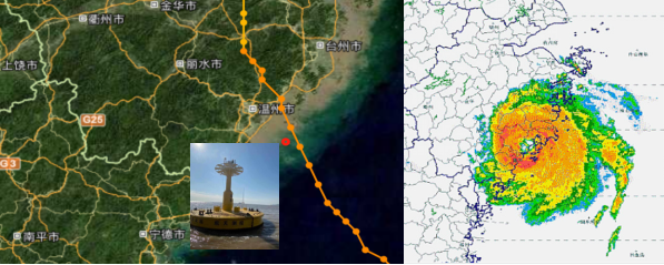 图3:华航漂浮式激光雷达安装位置示意图(左)与台风强度天气雷达图(右)